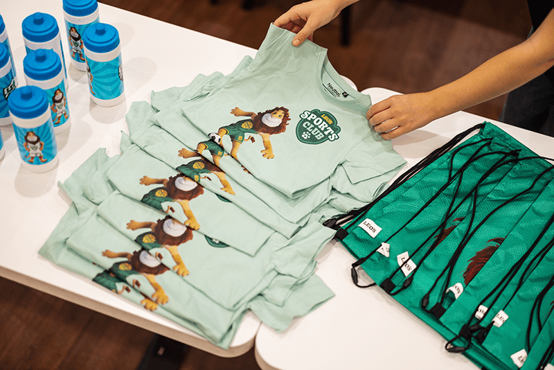 - Die Kinder tragen Leo’s T-Shirt, das bei der ersten Einheit verteilt wird, bequeme Hosen, in denen sie sich gut bewegen können, und Socken an den Füßen.