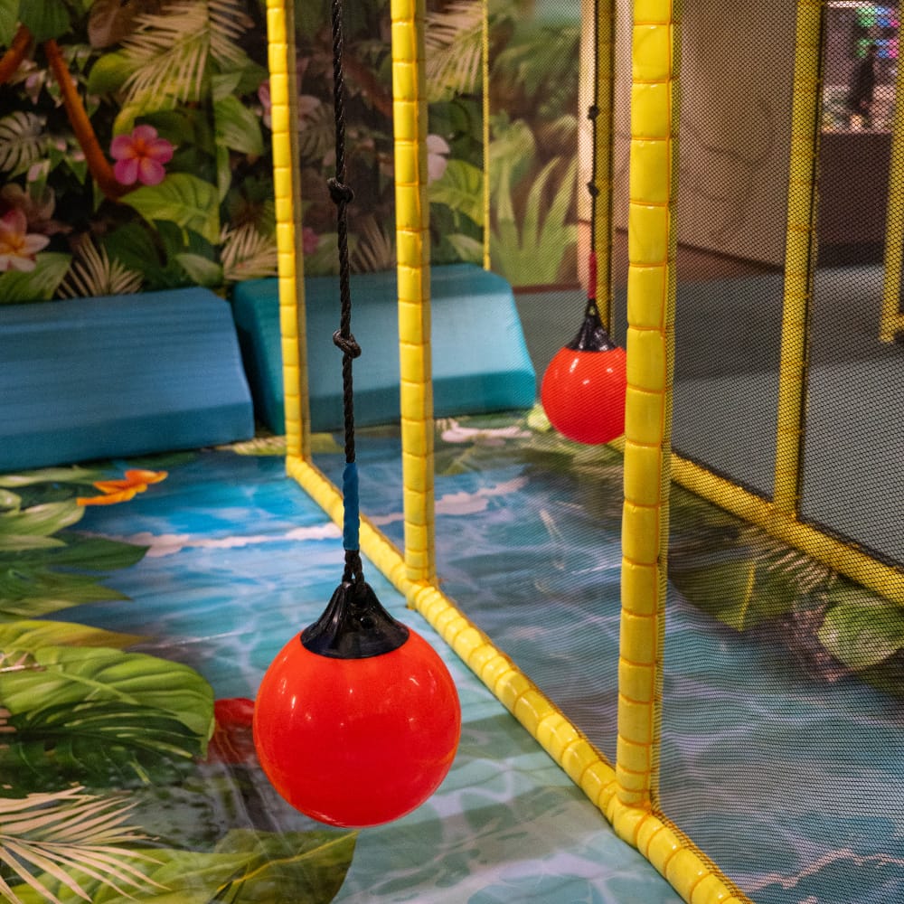 Schwing dich durch den Dschungel! Auf Leo’s Aerial Runway können mutige Entdecker sich an den hängenden Bällen festhalten, von einem zum nächsten schwingen und sich so ihren Weg bahnen. Spür den Adrenalinkick, während du dein Gleichgewicht, deine Kraft und deinen Mut auf die Probe stellst – jeder Sprung bringt neue Spannung.