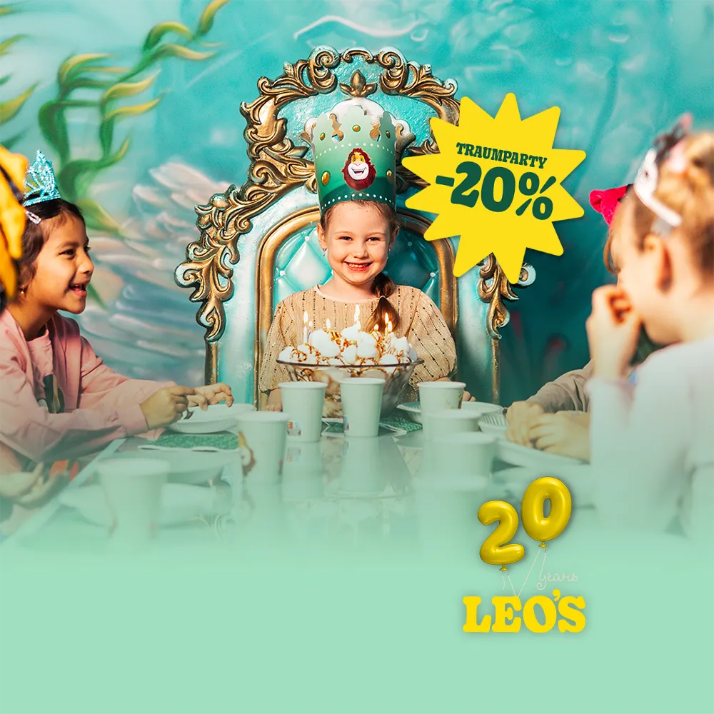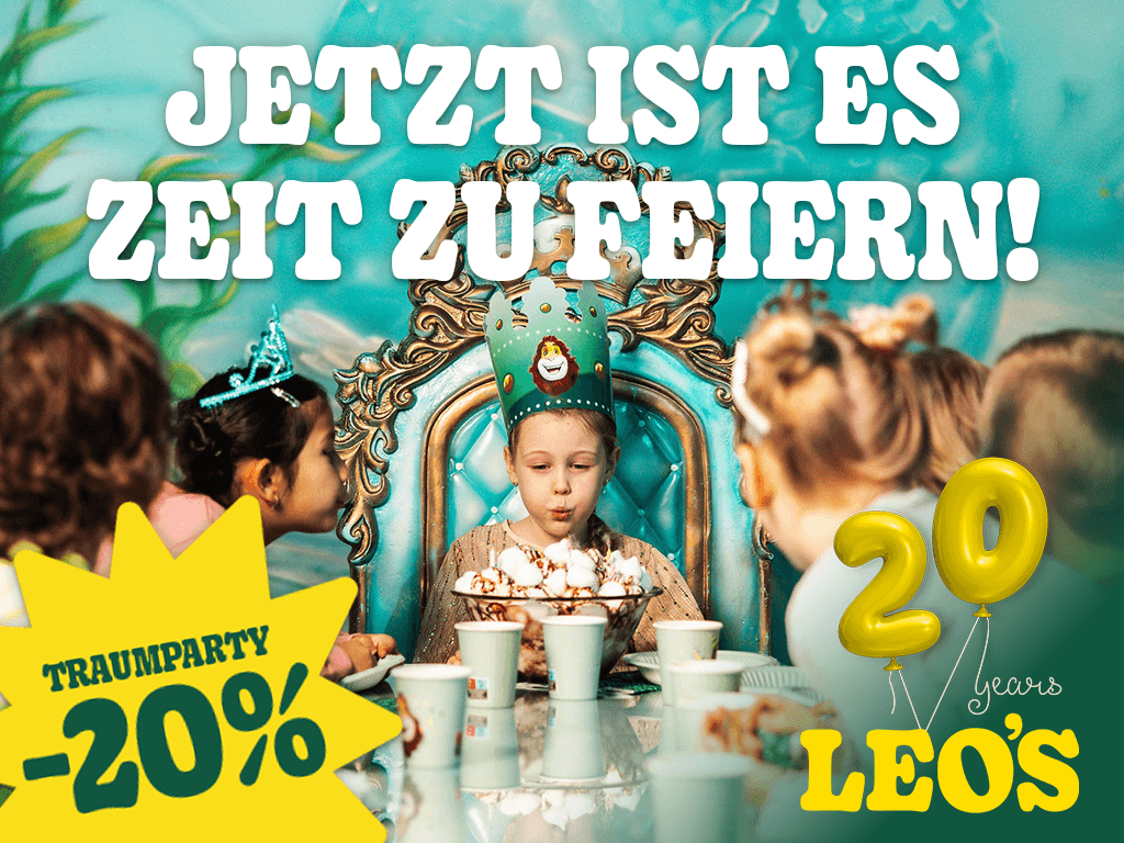 Feiere Leo’s 20. Geburtstag – jetzt Traumparty mit 20% Rabatt buchen. Angebot gültig bis 31. 01.2026!