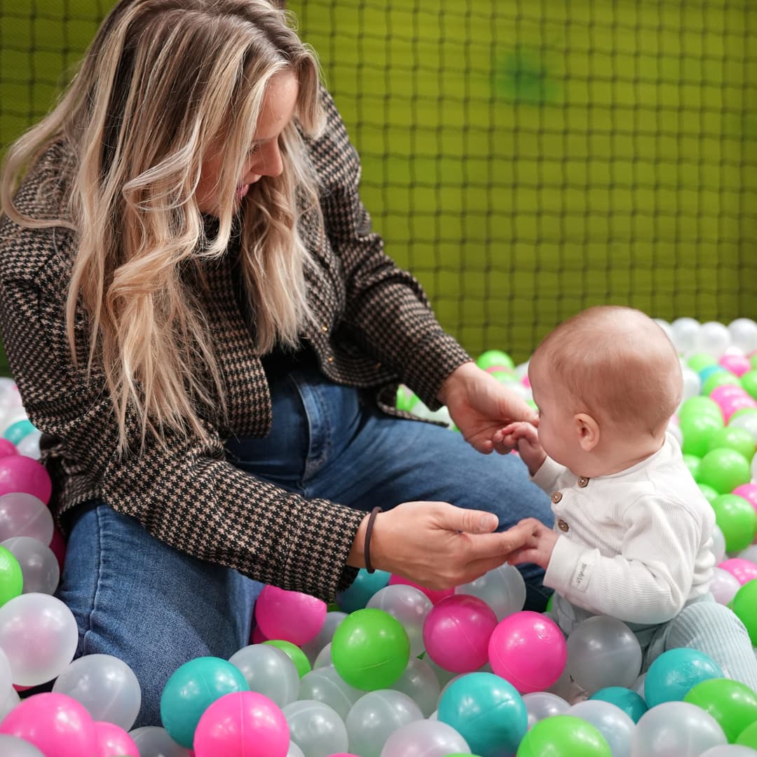 - Übe die Kontrolle über einen Ball: Nehmt einen Ball aus dem Bällebad und rollt ihn euch gegenseitig zu.