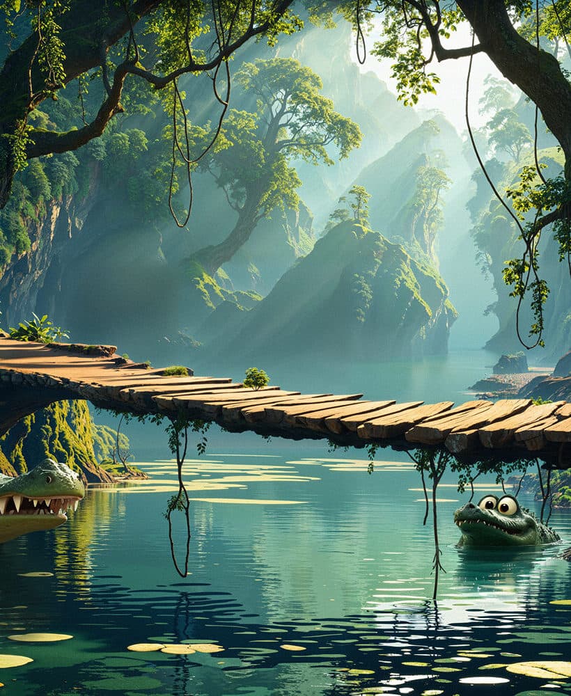 Leap over murky waters, swing on vines through the thick foliage, or keep your balance on wobbly logs. A swaying bridge leads you across the winding river, while the hum of insects and the distant calls of the swamp dwellers fill the air – the jungle comes to life, and you’re right in the middle of it!