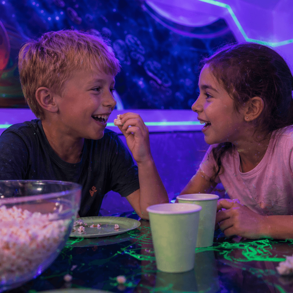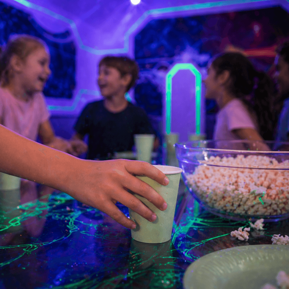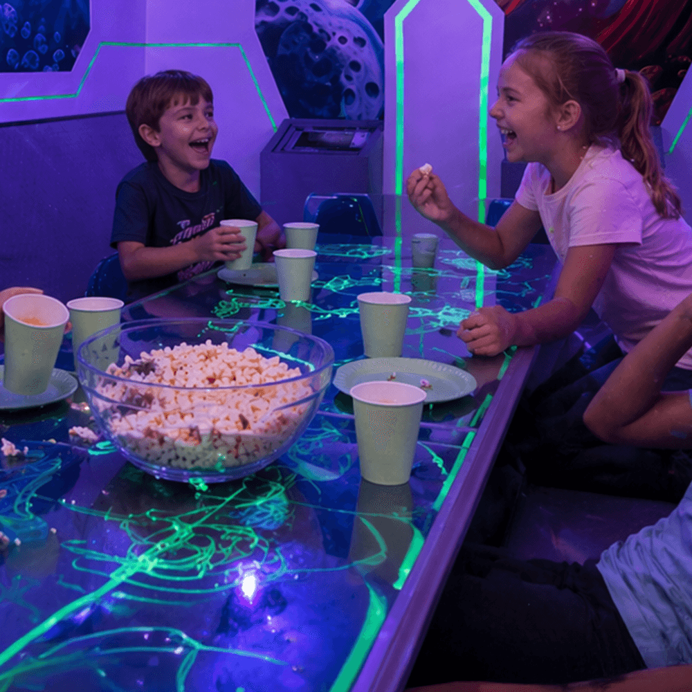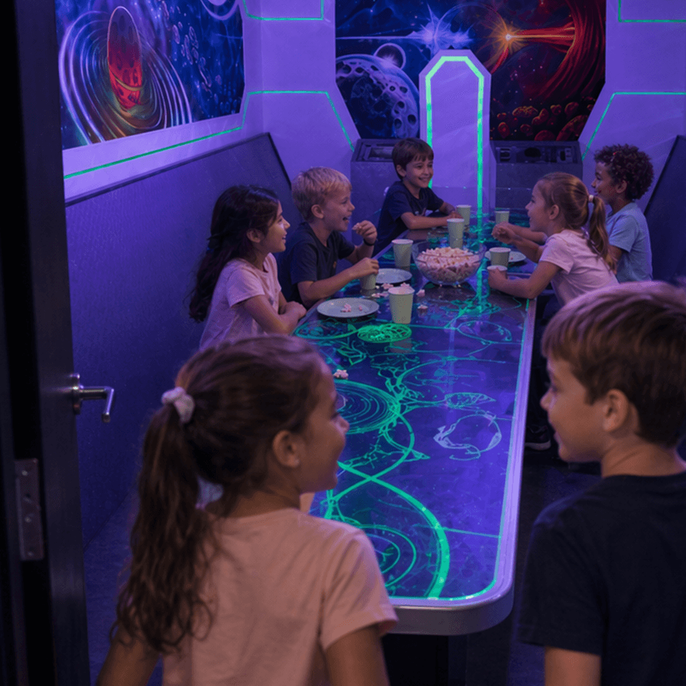 Der Weltraum-Partyraum wird zur gemeinsamen Raumschiffzentrale der Gruppe. Passend zum Motto gestaltet, bietet er einen gemütlichen Ort, um zusammenzukommen, etwas zu essen und Zeit miteinander zu verbringen. Hier entstehen besondere Momente, bevor es mit dem Spielen weitergeht.